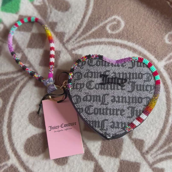 Juicy Couture brand heart shaped wristlet with artists signature style peyote stitch wrist strap and beaded edging. Zipper closure measures 5x5x1”